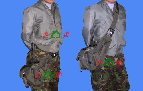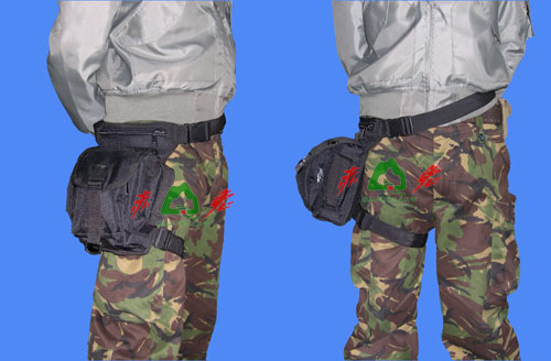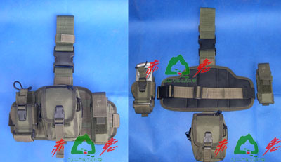 600D防水尼龙制 中间为大容量主包,两侧各一个副包可放置手电,手枪弹匣等。 摘除腿带可....
