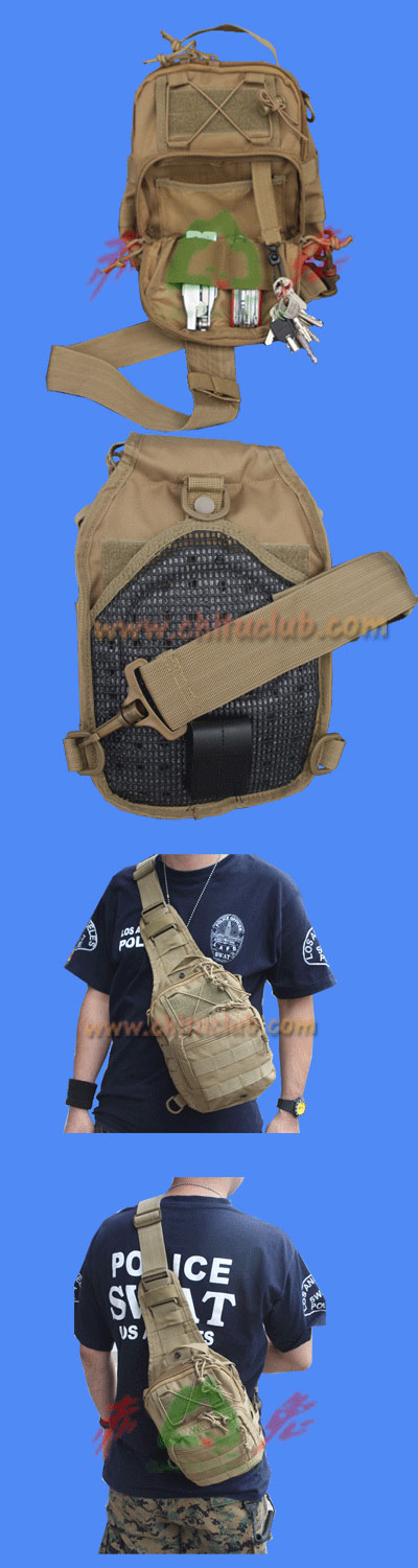 外层600D尼龙 防水防磨防刮 内层超强超轻300D尼龙细织 军标松紧带 军标织带 单肩背可背胸前,背后,可背在腋下,可挎在腰部更可挂在大腿外侧。颜色:ACU.泥色