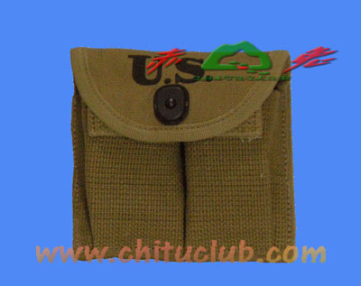 外贸品,纯棉质地 双排设计使它可携带两个二十发卡宾枪弹匣。弹袋下方设有两个扣眼,用以补偿其附挂在S腰带上后所挡住的扣眼,方便使用者附加其他装备。美军比较多的用法是将其套在卡宾枪的枪托上。