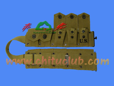 此宽腰带式弹夹包是为了携带.30口径步枪及M1加兰德步枪弹药所设计的,共十个弹袋。每个弹袋可容纳两个五发.30口径步枪弹药或一个八发M1加兰德步枪弹夹。腰带两侧附有扣眼,可与M1928主背包组合使用。是二战美军士兵标准装备之一。