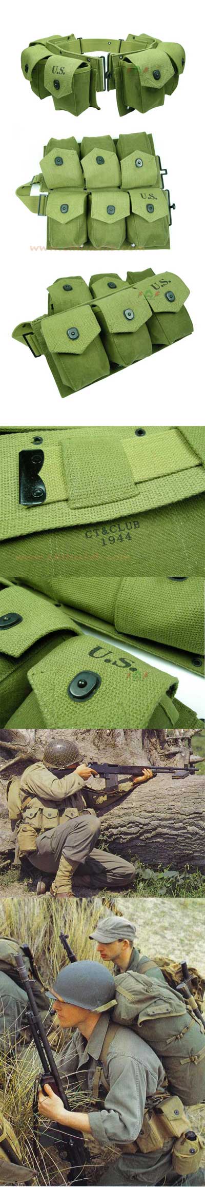 外贸品,纯棉质地此宽腰带式弹夹包是为了携带M1918式勃朗宁自动步枪弹药所设计的,共六个弹袋,腰带两侧附有扣眼,可与M1928主背包组合使用。是二战美军士兵的标准装备之一。