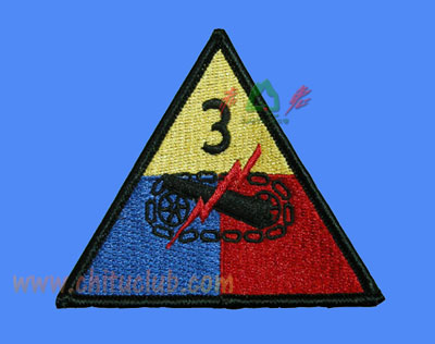 台湾产刺绣臂章 美国第3装甲师“Spearhead”绰号“矛头” 该师1941年组建,自1943年起一直在英国集结,直到D日开始。该师1941年组建,自1943年起一直在英国集结,直到D日开始。该师先后编入第7军和第1集团军,与许多其它美军装甲部队一样高速横穿法国大地,于9月,到达比利时。 1945年3月,进攻莱茵兰,在战争即将结束时,师长Maurice Rose少将意外身亡。此前,第3装甲师曾创下了单日推进100公里的惊人纪录,战争结束时,该师人员共获得3900枚铜星奖章。