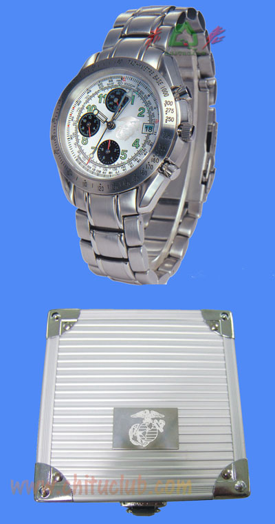 •走时(时、分、秒)、计时(1/20秒、秒、分、时)、日历功能•走时精度+20秒/月100米防水,防尘,防震•电池寿命二年 一、时间、日历设定方法: 1、时间设定:将巴的拉至2档,逆时针旋转巴的,准确调整到当前时、分时刻,但须注意是上、下午,以便使日历和时间同步。调整结束,将巴的推回原位,此时1/20秒的小秒针按通常秒运行。 2、日历设定:将巴的拉至1档,慢慢地逆时针旋转巴的,当日历调整到当前日期,停止旋转,并将巴的推回原位。 二、计时功能调整:调校前巴的必须在原位,即0位。 1、先按A按钮,再按B按钮,使秒计时大秒针及小秒针、秒计时分针、秒计时时针都归12点拉。 2、再按A按钮,这时中心大秒针开始秒计时,同时1/20秒的小秒针也开始计秒,但当1/20秒的小秒针运行到30秒钟,小秒针调回到12点位置停止(目的是为了节约耗电量,但在集成电路里还在继续计时动作)。 3、当计时达到设定要求时,按压A按钮,计时停止,这时则可读出此时段所用时间。 4、按压B按钮,中心大秒针、小秒针、秒计时分针、秒计时时针全部回归12点位。小秒针由1/20秒计时转换为通常秒计时的调整:当中心大秒针和小秒针都停在12点位置时,按压B按钮,1/20秒的小秒针就会转换成通常一秒一秒运走的状态,要恢复1/20秒计时,则再按压B按钮,小秒针归12点位。 三、大/小秒针位置的调整:当中心大秒针和小秒针不在12点位时,可将巴的拉至2档,先将A按钮调校中心大秒针至12点位,再按B按钮调校小秒针至12点位,调校结束将巴的推回原位,此时1/20秒的小秒针转换为通常秒运行。 使用手表之注意事项: 1.中心大秒针运行时,按压B按钮则中心大秒针、小秒针都会回归12点位,读不出所需时段的时间。 2.装针前必须进行机芯调整,即先按A按钮,再按B按钮一次,如果不这样做,秒计时大秒针、小秒针、秒计时秒针、秒计时时针可能调回不到正确的12点位。 3.勿在巴的处于2档时按压A、B按钮,否则,中心大秒针、小秒针都回不到12点位,需要重新按调整第4条进行调校。 4.勿在中心大秒针计量时拉出巴的,使之不能读出所需时段的时间,测量无法进行。