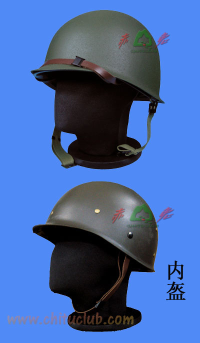 内外双层,带牛皮固定带以及护头后衬。外层钢制,内层为玻璃纤维制。 均码,无尺码区别。 1942年,美军正式配备M1钢盔全面取代M1917型钢盔。其实,早在1941年6月,美军就已将M1钢盔配备少部份单位进行试验,当时美军的M1钢盔上所用的悬吊系统采用的是类似美式足球选手头上戴的头盔所用的悬吊系统,这种悬吊系统稳定性能良好,钢盔与头部之间有一定的空隙,整个悬吊系统是由头带、吊床、汗圈、套环等组件所构成,这种设计乃是为了让钢盔受到冲击时能将其力分散至整个头部进而降低整个钢盔被穿透的可能性。