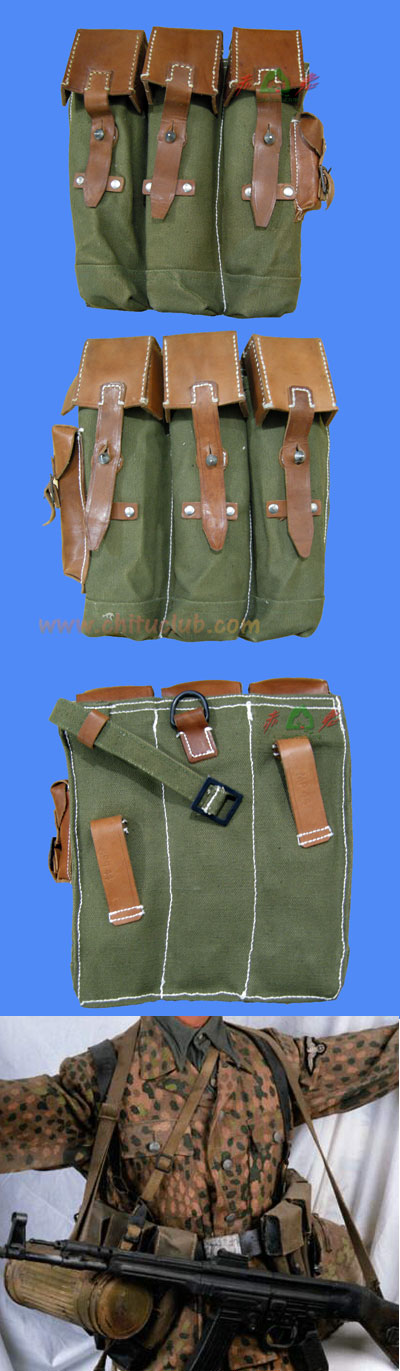 MP44是现代步兵史上最大的成就之一。MP44是德国黑内尔公司与毛瑟公司和埃尔玛公司在第二次世界大战末期开始大量生产的突击步枪,也是世界上最先使用中间型枪弹的突击步枪。用了中间型威力枪弹。 1944年,MP43易名MP44,后又改称StG44型,也就德国通常所说的44型突击步枪(stg44突击步枪)。后来根据战场的需要,设计人员又为其设计了一些附属备件。其中用于瞄准装置的有ZF-4型光学瞄准镜和ZG-1229型红外夜视装置,ZG-1229红外夜视装置于1943年研制,到二战结束时共生产了约310套装备部队。有意思的是,设计人员还为StG44专门研制了两种弧形附加枪管,一种弧度为30度,另外一种弧度为90度。前者是方便士兵从建筑物后发射子弹,后者是为方便乘坐在坦克装甲车辆内的士兵在车内扫射逼近的敌人。虽然没有明确的记录来证实这两种弧形附加枪管的真实效果。 纯牛皮帆布材质,德军MP44专用弹夹包。 一对两个,每个可放三个弹夹。
