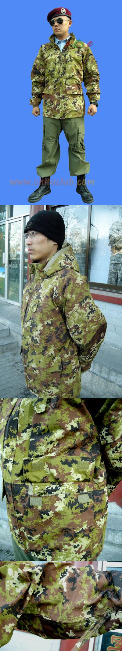 S M L XL (欧码,号码偏大) 意大利丛林迷彩GORE-TEX冲锋衣彩 防风、透气、防水、风帽可收藏在领子了。 腋下有拉锁,可调节身体温度与湿度。 整件衣服共8个兜。所有内部接缝处均有压胶。 G8冲锋衣内的Gore-Tex面料是美国戈尔公司的王牌,因为它一平方英寸上有90亿个微细孔不规则排列,所以可以使它阻挡一切冷风的侵入,而它每个微细孔又比人体的汗分子大700倍,汗气可以从容通过面料,所以G8冲锋衣配合Gore-Tex的举措,无疑是一种锦上添花,G8的风帽是可以收藏在领子里的,它腰间配有塑身收绳,其腋下还配有疏通拉链,衣服整体共有八个口袋,口袋翻盖全部都是加长设计,所有的接缝处均是压胶,更加体现防水效果!G8之所以可以在众多款型中脱颖而出,替代旧款风衣,也归功于其出众的综合能力!