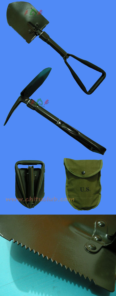 可完成铲砍锯刨等多重作业,操作简单一锹多用,结构紧凑小巧轻便便于携带。折叠锹的锹头与锹柄衔接于一根连接管上,拧松固定套,可以将锹头轴转动90°或180°、再拧紧固定便可使头部保持固定,方便作业。