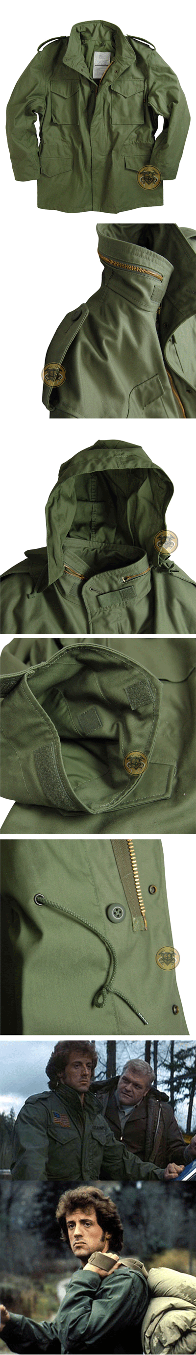 材质:棉缎挡风外层(50%棉,50%尼龙棉),最大承裂力225磅 功能:隐蔽式风帽; 前襟有重型黄铜拉练和按扣两重闭合装置; 腰部、风帽和下摆都带拉绳,可收紧; 预留纽扣,可装内夹衬;箱式胸袋;带按扣翻盖外衣袋; 袖口加尼龙搭扣,可固定手套沿,确保完全保护双手; 防水; 共经历139道缝纫工序 M65野外风衣的衣领采用小开领与风领结合的设计,在常温下可以将衣领外翻,作小开领式样穿着,以达到美观舒适的效果;在野外状态下,只要将小开领立起来,就会在穿着者的颈部形成一个由衣领形成的保护圈,达到保暖的目的。但这还不算真正的“风领”,因为在竖起来的衣领里还隐藏着一个纯棉布制作的风帽,在更为寒冷的时节,士兵们可以立起风领,带上风帽,既保暖又安全。此外,在风领接近肩部的位置和领尖位置还开有4个预留的扣孔,主要是为了在严寒难挡的季节连接M65野 外风衣专用的棉芯毛边御寒风帽。为了使这个风领更加保暖,在领口处还设有尼龙维可牢魔术贴,以便使立着的风领不至于散开。 在风衣的两肩,还设有两条结实的肩带。肩部和衣袖的连接部位采用了所谓的“骑士肩”设计,目的是突出穿着者宽阔的肩膀,使穿着者显得十分威武。由此可见,在注重使用功能的同时也十分注重风衣穿着的美观。 衣襟采用黄铜拉链和紫铜暗扣相结合的方式,在野外状态下穿脱十分方便。独具特色的黄铜拉链成为M65野 外风衣设计上的亮点之一,几乎每一家获得美国官方采购合同的公司都无一例外地在黄铜拉链上刻下公司的英文缩写。