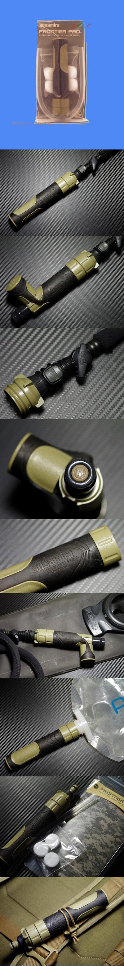 Aquamira公司最新产品 军版可与驼峰水囊相互连接 此产品实用性和通用性颇强,且体积便于携带 滤芯大致的寿命为50加仑(折190升的水) 标配包括一透明吸管, 一包备用滤棉 吸嘴盖帽的顶端有品牌及型号标识 类似口红的吸嘴部分,有 BITE ME 字样 设计有弹性橡皮相接的盖帽 吸嘴设计的专利 #6039305 尾部旋口可开启,方便填充标配的过滤棉和接吸管之用 两阶段滤清: 第一道可替换的前过滤棉可去除更大的微粒。 第二道Aquamira多孔塑料microfilter去除99.9% Cryptosporidium,贾第鞭毛虫 螺旋口通用于鸭嘴兽,可乐,雪碧之类的国际通用28mm接口 长度:125mm 重量:57克
