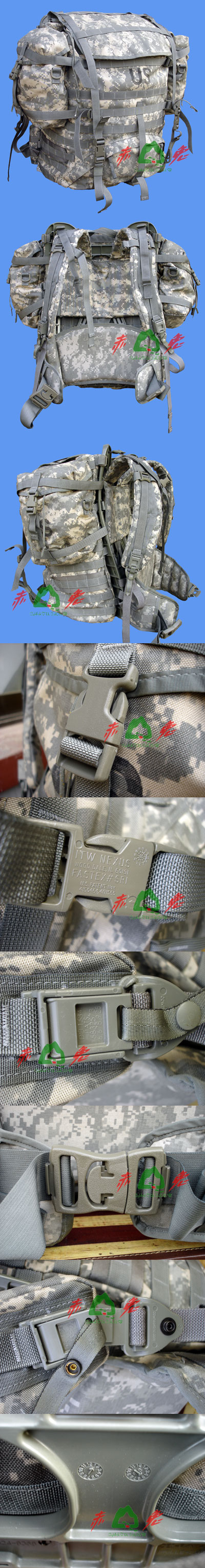美军公发原品颜色:ACU迷彩主包容量:70L附带两个可拆卸耳包,采用轻量化非金属材质背架,背负系统可调节。主包全molle系统模块化织带,军版扣具,军规尼龙织带,G-TEX防水面料