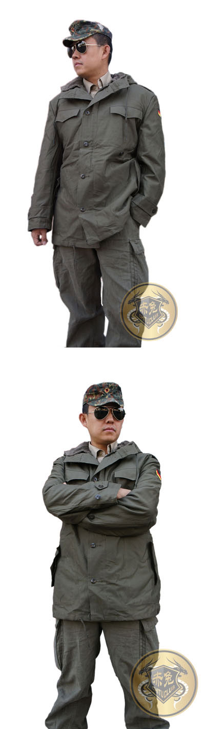 著名的德军驼绒大衣。1950年代进入德军服役。代表了德国制造高品质的标准。前联邦德国国防军制式冬装。采用德军惯例的长身、高领设计,保护身体不受寒风侵袭。以其实用、保暖、样式经久不衰等特点深受军人和广大军迷的喜爱 大衣采用风帽一体型的设计。帽子边缘有隐藏式拉绳设计,能视个人头型调整大小。双肩章扣采用合式设计。左右两袖均有车绣德国国旗。以大型拉链作为开阖,拉链上并覆有以钮扣扣合的外盖,避免作战时产生反光。大衣下摆处也有隐藏式拉绳设计,避免冷风灌入。大衣左右前胸处的两个口袋为内藏式设计,并且有外盖覆盖,与大衣开合处设计相同。而左胸内层也加缝一内袋,可放置较私密的小册子或随身物品。 可拆卸驼绒内胆,超强保暖 带绳索的固定式风衣帽 两个胸前口袋,两个插入式口袋 一个大的内兜 腰部以及风衣底部带有伸缩绳索,可调节为夹克或者风衣式样 双臂有德国国旗