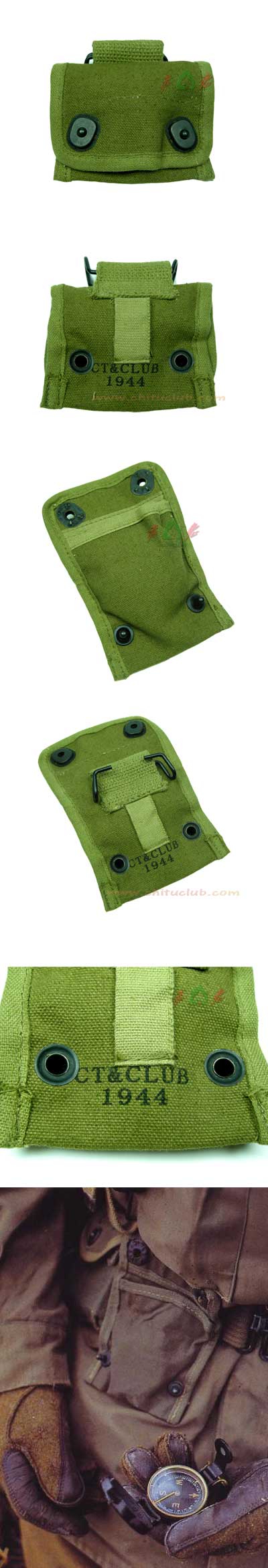 二战时期的美军军官配发的装备还包括地图包、指北针等,指北针对美军行军打仗,测绘方位等有着重要作用,因此美军专门制作了指北针包用来携带指北针。指北针包整体采用帆布制,纯铜龟扣,大翻盖结构。同样采用挂钩与扣眼的连接方式,可以和美军其他弹药带任意组合