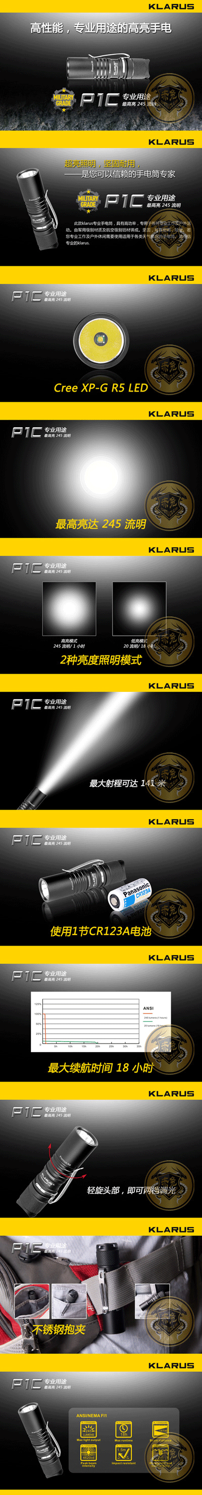 最大输出245流明最大续航时间33小时采用CREE XP-G R5 LED两种输出模式,操作方便战术正向开关,瞬间点亮功能可拆卸抱夹IPX8级防水设计