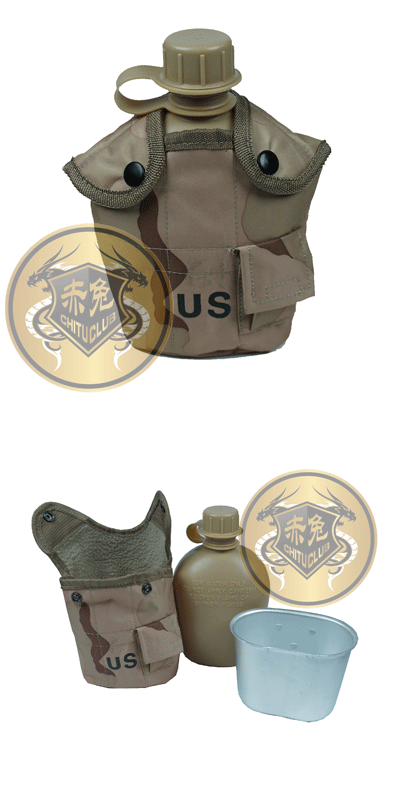 三色沙漠迷彩水壶,容积1升,高分子塑料制,耐高温,抗腐蚀.无异味.带三色沙漠迷彩尼龙保温套,带铝制饭盒.及外置放净水药片的小包.