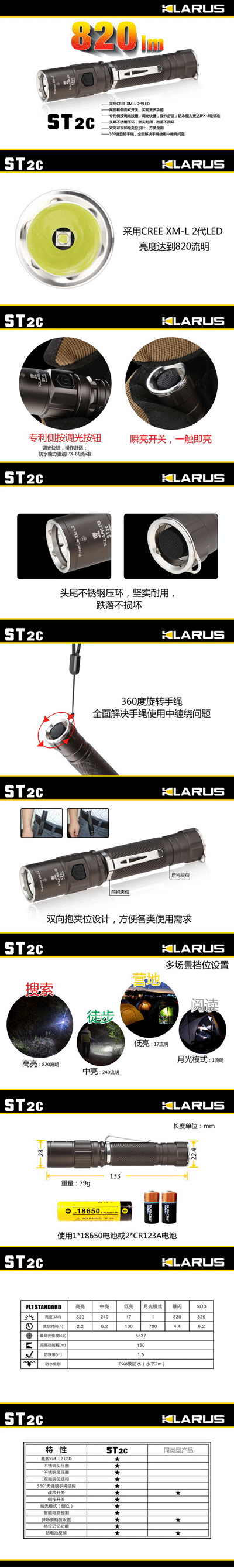 1. 使用Cree XM-L2 LED, 使用寿命高达50000小时 2. 6种照明模式 3. 工作电压: 3.0V-8.4V 4. 电池: 1 x 18650 /2 x CR123A(建议不要使用16340锂离子充电电池或电压超过3V的其他任何电池) 5. 颜色:深灰色硬质阳极氧化 6. 光杯:光面反光杯 7. 镜片:钢化玻璃 8. 尺寸:133mm(长)x 28 mm(头部)x 22.4mm(筒身) 9. 重量:79克(不含电池) 说明: 测试的电池规格:18650电池*2200mAh/4.2V;所有测试数据误差范围为±5%,以凯瑞兹的测试环境和测试方法为准。以其他测试环境和测试方法测试的结果可能会与凯瑞兹的测试结果有所差异。 警示:请不要将不同规格、不同品牌、、新旧不同的电池混合使用,以免损坏电池或手电。 18650锂离子(Li-ion)电池属于工业电芯,并非有安全保障的民用电池,当电池品质不良或者使用不当(短路、高温等等)时可能发生燃烧、爆炸并危及人身和财产安全,若使用此电池种类应明白其中的风险并自愿承担相应的责任。使用品质优秀并带有保护电路的锂离子电池会在一定程度上降低风险。 操作方法 A.以尾部关机使用方法 尾部电源开关: 轻按点亮,重按锁定;再重按断电关机。 如需其他功能,请参考B、C部分! B.以头部关机使用方法 侧按开关(尾部开关点亮状态): ——点亮状态,单击休眠关机; ——单击(1秒内)点亮,长按1秒锁定照明;再长按换档,4档循环 (注意:月光模式亮度极低,易被误认为关机); ——任何状态双击进入暴闪,单击退回进入状态; ——暴闪中长按进入SOS,单击休眠关机。