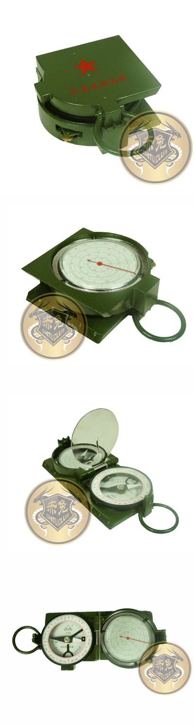 六·五式罗盘仪是测定方位、距离、水平、坡度(俯仰角度)、高度、行路时间速度及测绘简单地图的一种简易测量器材,为便于夜间使用,在其各相应部位上涂有夜光粉。