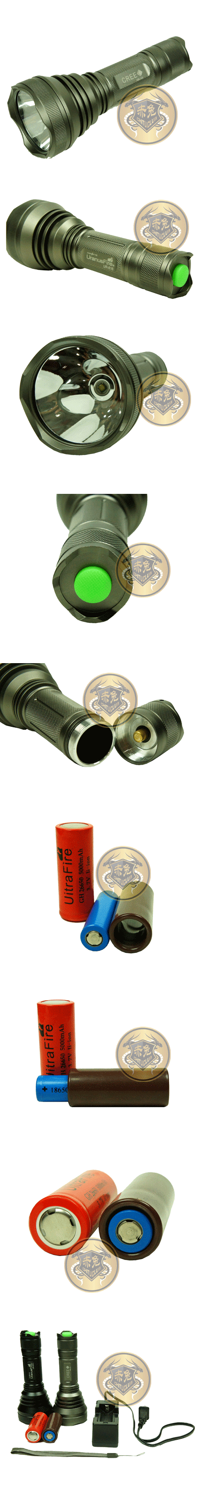 采用CREE XML U2光源,亮度高达900流明,使用寿命长达10万小时。外壳采用航空铝合金材料,硬质氧化处理,光滑,耐磨,抗蚀,防摔。 电池可使用26650和18650两种规格的充电锂电池,强光可持续照明4小时左右。 规格:160mm(全长)*34mm(筒身直径)*62mm(头部直径) 重量:250g 五档调光;高-900流明 中-438流明 低-148流明 爆闪-900流明 SOS-国际求救信号