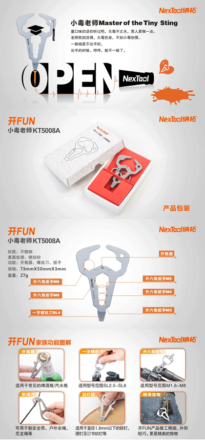 材质:不锈钢表面处理:喷幼砂功能:开瓶器、螺丝刀、六角扳手规格:73mmX50mmX3mm重量:27g