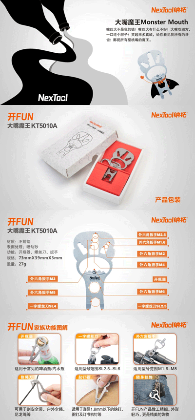 材质:不锈钢表面处理:喷幼砂功能:开瓶器、螺丝刀、六角扳手规格:73mmX39mmX3mm重量:27g