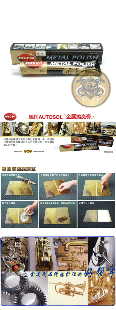 1、本产品为多用途的金属抛光剂,膏状,挥发性低,不含毒素,气味芬芳,绝对环保。 2、金属擦铜膏清洁、擦亮抛光、保护及去锈一步到位。 3、因其含有超细之研磨颗粒,可将毛糙的金属表面处理至镜面效果,也可去除因于日久而产生的氧化层,并且在金属表面覆以超薄保护层,从而防止金属再次氧化,使得金属持久如新。 4、金属擦铜膏能给予金属表面耀目光泽及长久的全天候保护作用。 [使用方法]