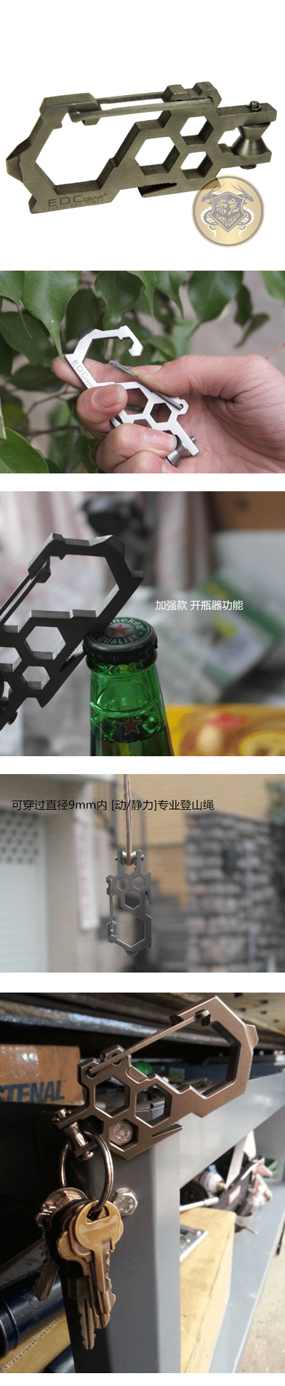 尺寸;厚7mm 长90mm 宽38mm主要功能;除了高承重挂载使用外,滑轮系统带给你繁多实用的功能【工程/重物搬运/救险救灾/过河泅渡等】,本体上附有多种规格的内角开启功能,1/4转接头/大一字螺丝刀/开瓶器等等