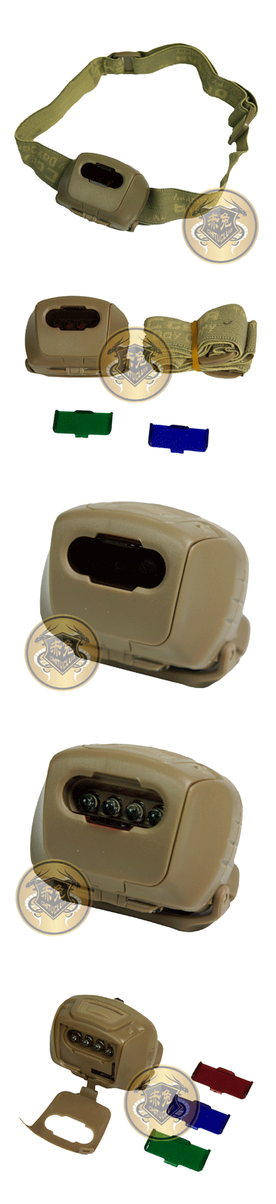 附送3种滤光片[红色 蓝色 绿色 ]可在不同户外环境使用,提高战术头灯系统适应性