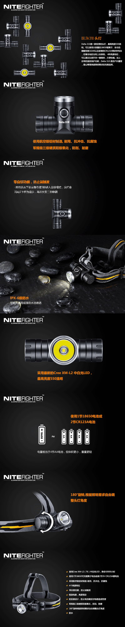 产品特点: l 使用Cree XM-L2(T6)中白光LED,寿命50000小时 l 使用1节18650可充锂离子电池或者2节3V CR123A锂电池 l 采用航空级铝材制造-耐用、抗冲击、抗腐蚀 l 4个亮度档位 l 带自锁功能,防止误触发 l 恒流电路,亮度恒定 l 防反接设计,防止电池装反对电路造成危害 l 军规级三级硬质阳极氧化,防刮、耐磨 l 180°旋转根据照明需求自由调整头灯角度 l 防水 操作说明: l 轻触按键可开启头灯。 l 头灯点亮时,再次轻触按钮,即可按低亮-中亮-高亮-极亮循环的顺序调节亮度。 l 长按按钮0.8秒,关闭头灯。 l 关机状态下长安操作键3秒进入自锁模式,头灯会闪动2下作为提示,再次长安三秒解锁。 l 手电会自动记忆照明亮度,每次打开时都会以关闭前的亮度档开始工作。