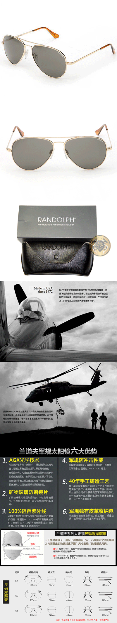 【商品名称】 美国Randolph 经典款 CONCORDE飞行员太阳镜(金框灰片)