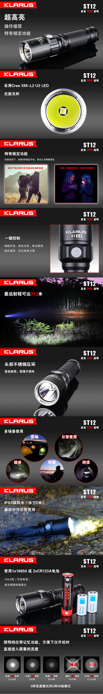 ? 采用CREE XM-L2 U2 1A LED,亮度达到900流明 ? 侧按开关,单击点亮,单击换档,操作简单,符合人的使用习惯 ? 小巧轻便,非常适合日常或户外活动时携带使用 ? 照明档位带记忆功能,方便下次开机时直接进入需要的亮度 ? 防水能力达IPX-8级标准(水下2米),更可放心在暴雨中使用 ? 头部不锈钢压环,坚实耐用,跌落不损坏 ? 特有锁定功能,在需要避免误点亮的情况下,可锁定手电避免开机点亮 ? 使用Cree XM-L2 U2 1A LED, 使用寿命高达50000小时 ? 3种亮度模式2种闪烁模式 ? 工作电压: 3V-6.4V ? 电池: 1 x 18650锂离子电池或2 x CR123A一次性锂离子电池 ? 颜色:黑色硬质阳极氧化 ? 光杯:光面反光杯 ? 镜片:钢化玻璃,镀膜 ? 尺寸:133.7mm(长)x 34.5mm(头部)x 25.4mm(筒身) ? 重量:134.6克(不含电池)
