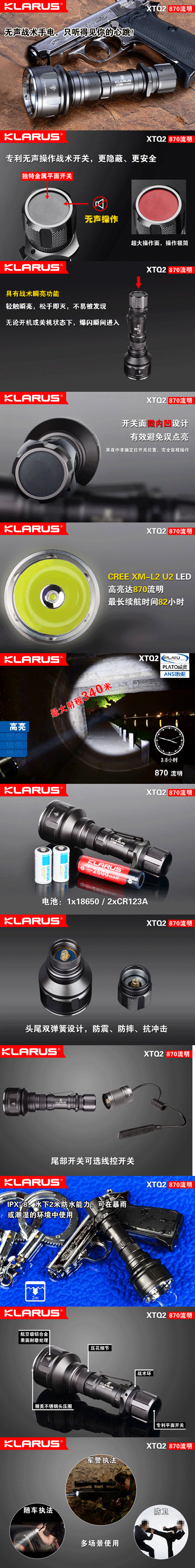 ? 专利无声操作战术开关,更隐蔽更安全 ? 独特金属平面开关,超大操作面,操作极简 黑夜中准确定位开关位置,完全盲视操作 ? 具有战术瞬亮功能,轻触瞬亮,松手即灭,不易被发现 ? 任何状态下,爆闪瞬间进入;变频爆闪,持续眩晕眼睛 ? 大口径头部设计,专为增强聚光远射能力而设计,射程达340米,光斑完美 ? 开关面微内凹设计,有效避免误点亮 ? 头尾双弹簧设计,防震、防摔、抗冲击 ? 美国CREE XM-L2 U2 LED,亮度870流明 ? 智能电路控制,平衡高亮、长续航、快速散热等,保证手电明亮又可靠 ? 新型光学系统,射程达340米,光斑完美 ? 哑光不锈钢头压圈设计,坚固耐用,可做攻击防卫武器 ? 钢化玻璃镜片,镀AR膜,硬度高,耐腐蚀 ? 防水IPX-8设计,达到水下2米标准,可在暴雨中正常使用 ? 航天级铝合金筒身,硬度高,精加工,无瑕疵 ? 可倒立做蜡烛长时间使用 ? 电池反接保护,不损坏手电和电池,安全可靠 ? 军工品质,精工细作,耐磨,耐刮 ? 使用CREE XM-L2 U2 LED, 使用寿命高达50000小时