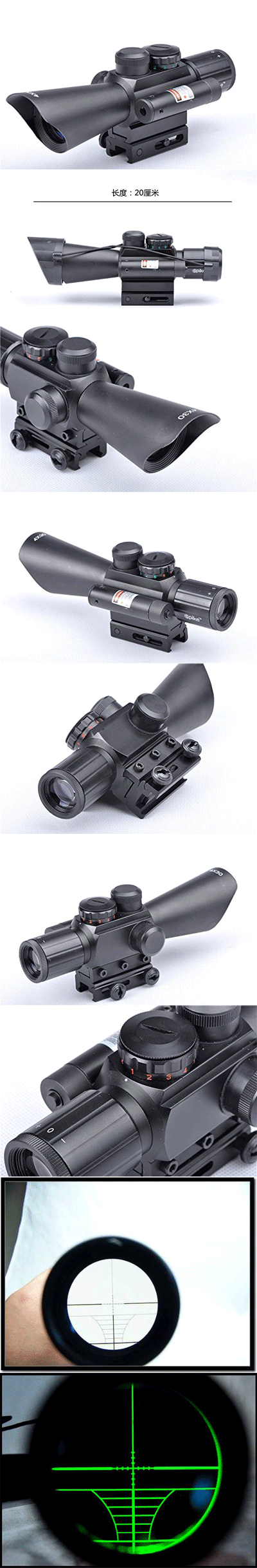 倍率:4倍物镜:30 斜口设计管径:25.4长度:190毫米镀膜:蓝色特点:带红激光瞄准器 可以单独调节弹道,设置不同的归零点,晚上使用非常方便夹具:自带连体12MM和20MM夹具一套