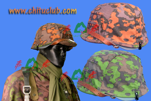盔罩为双面迷彩,左右后三面均用挂钩固定,上世纪40年代德军野战部队普遍使用。